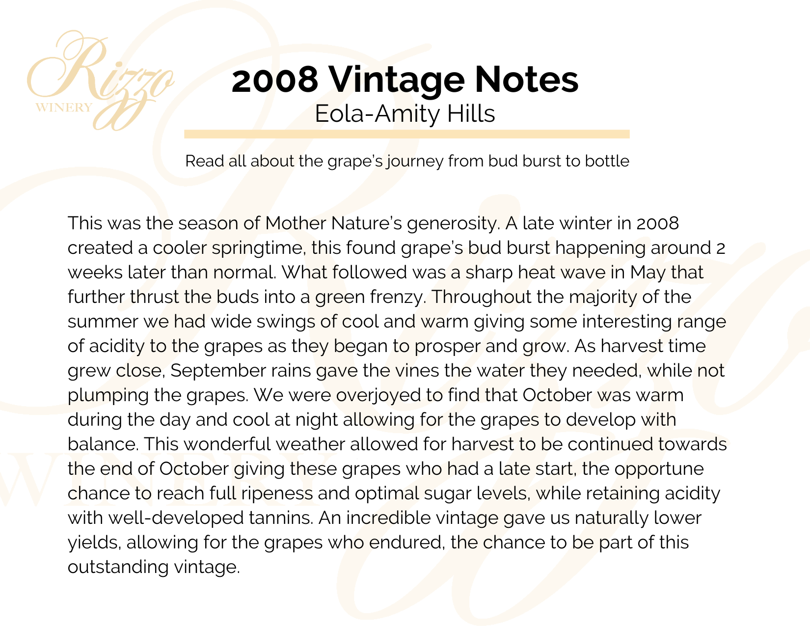 One of the most picture-perfect vintages the Willamette Valley has ever seen. A vintage that created a wine that was rushed into wine cellars by buyers, leaving it sold out to anyone late to the game. Luckily for all of you, we are sharing our cellar with you, so you can have a luxurious tasting experience with the 2008 vintage.