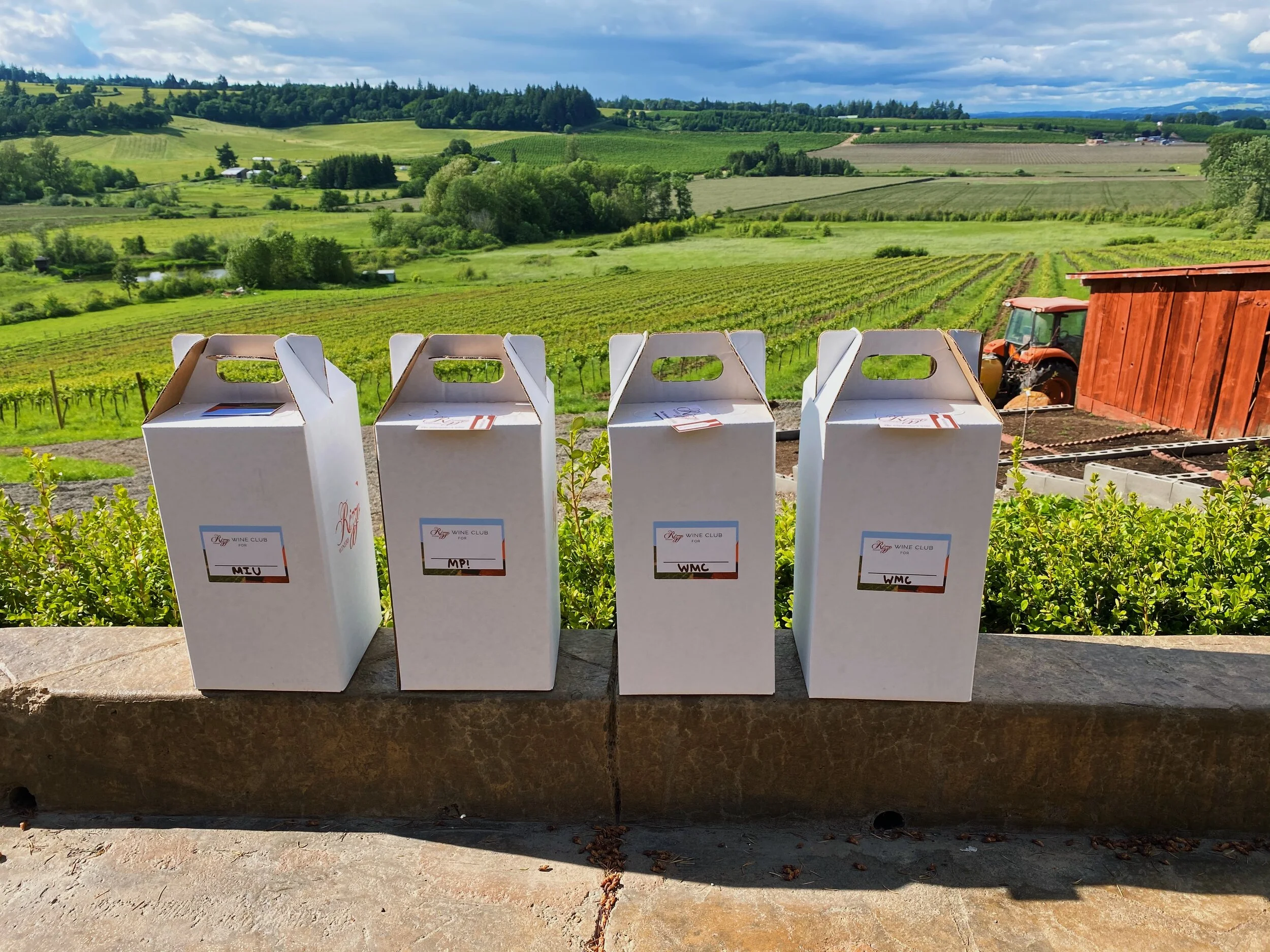 Our Wine Club Shipments ready for pick-up with their cute new sticker name tags and logo’d sides.